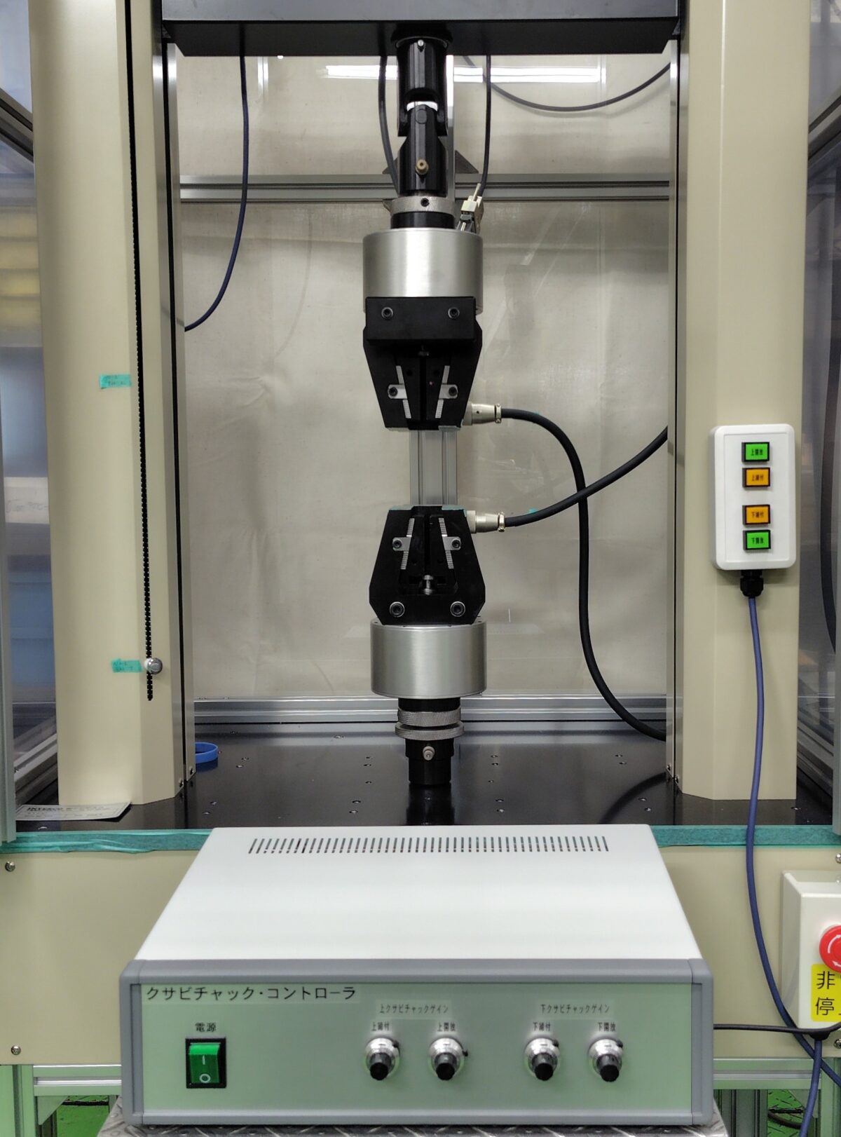 足踏みスイッチ等で上/下グリップのクランプ動作が順次出来るため、両手を自由に使い試験片の位置決めを確実にします。