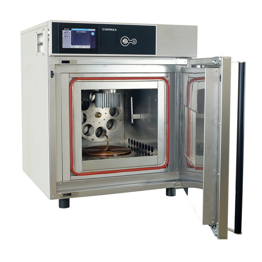 RTFOTは、瀝青質材料を試験容器に薄膜状に塗布し、送風しながら加熱の効果を与えます。試料容器を回転式のフレームに8個までセットすることができます。4.5インチのタッチスクリーンから、タイマなどの試験条件を設定します。安全装置も充実しています。